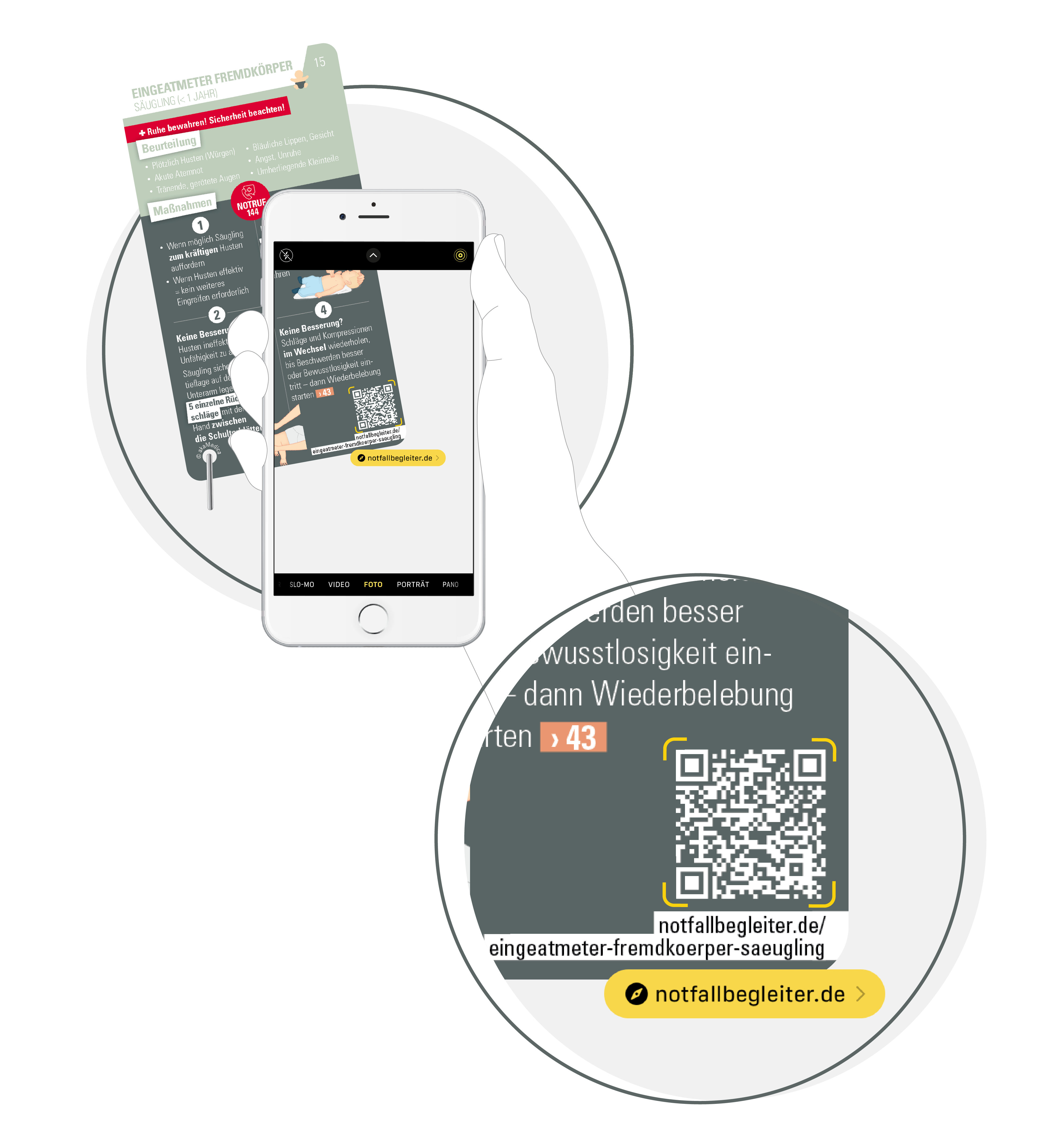 - Folge einfach dem QR-Code auf jeder Notfallkarte im Notfallbegleiter und gelange direkt zum Erklärvideo deines gesuchten Notfalls.