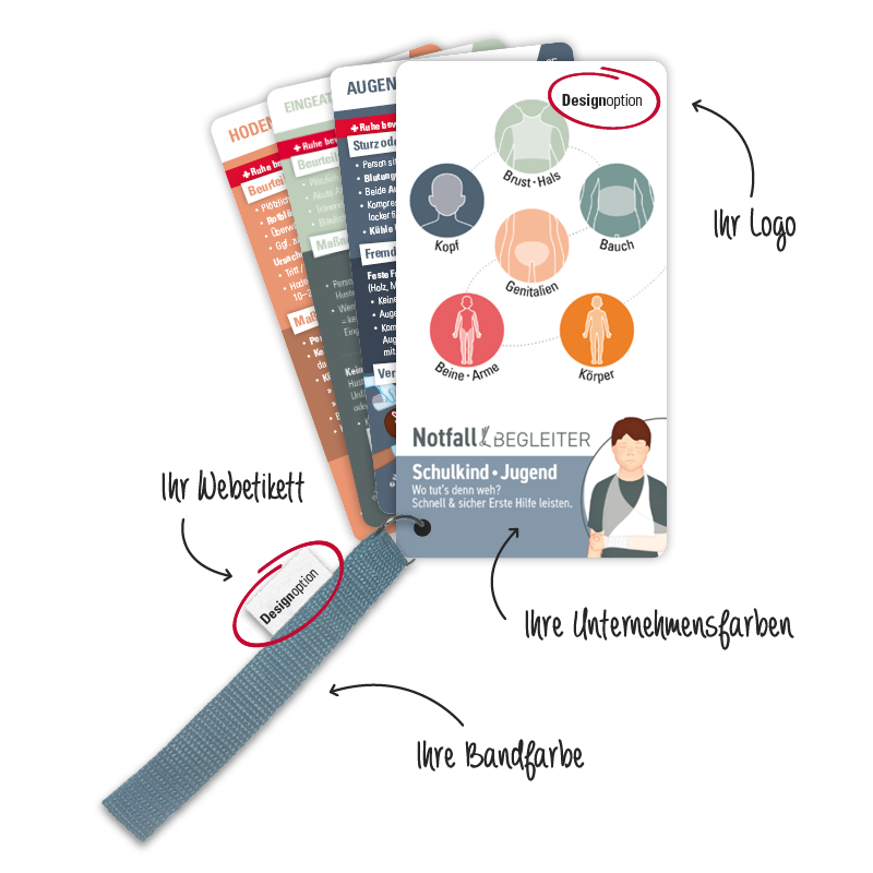 Labeln Sie den Notfallbegleiter in Ihrem Unternehmensdesign und setzen Sie auf den Notfallbegleiter als individuelles Geschenk für Ihre KundInnen, PatienInnen, anvertrauten Eltern. -