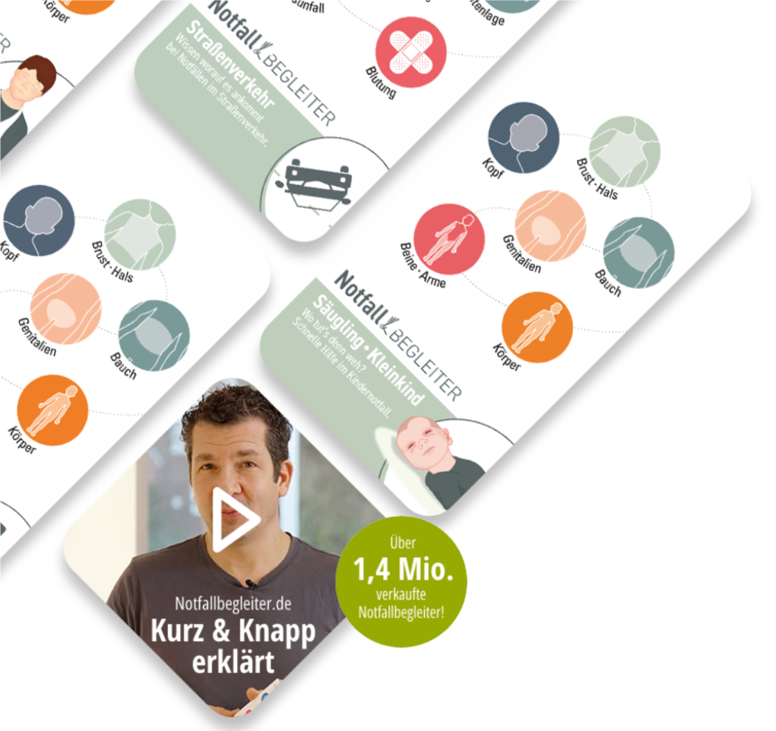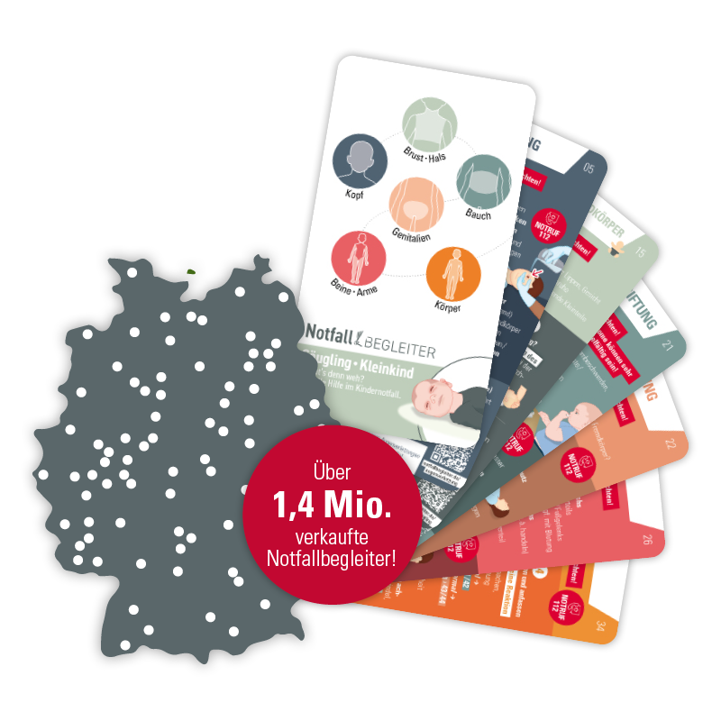 Seit über 10 Jahren erfolgreich auf dem Markt, über 1,4 Millionen verkaufte Notfallbegleiter, positive Erfahrungsberichte im Notfallhandling und zufriedene Kunden in unseren Erste-Hilfe-Kursen & Seminaren online & offline, treiben uns an noch mehr über Erste Hilfe im Kindernotfall zu informieren.