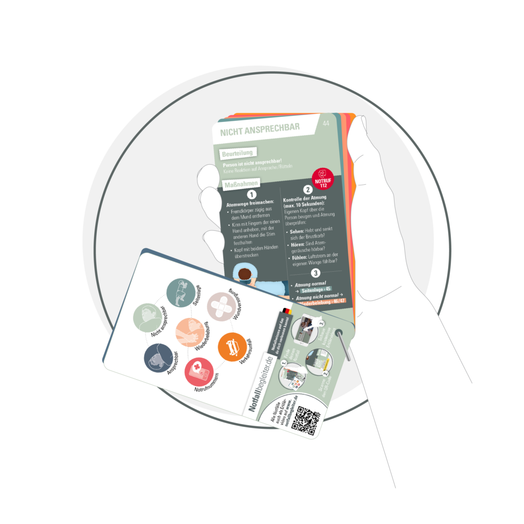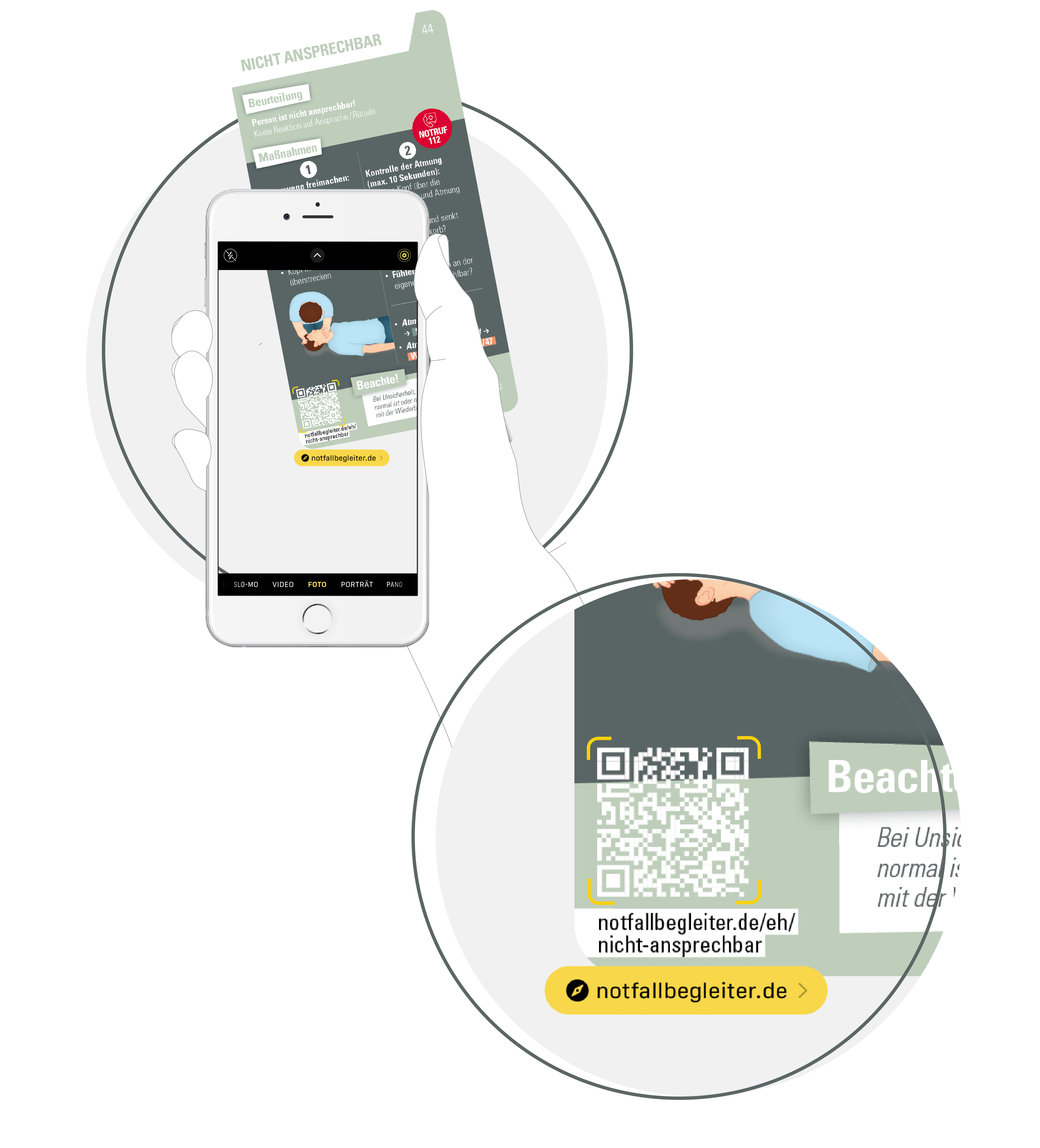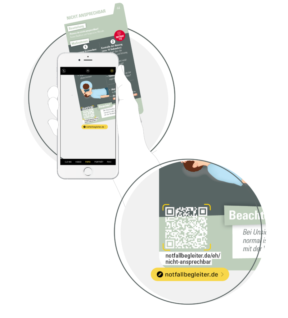 - Folge einfach dem QR-Code auf jeder Notfallkarte im Notfallbegleiter und gelange direkt zum Erklärvideo deines gesuchten Notfalls.
